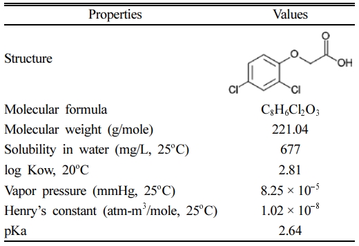 페녹시계 제초제인 2,4-D(2,4-dichlorophenoxyacetic acid)는 내분비계 교란물질로 식물 호르몬(auxin)과 같은 계열의 유기화합물질이다(Jaafarzadeh et al., 2018). 가격이 저렴하고, 효과가 좋아 전세계적으로 널리 사용되나 화학적 안정성과 잔류성으로 인하여 토양에 축적되거나 지하수 및 하천수로 유출되어 환경 문제를 유발한다. 2,4-D는 인간에 대한 신경 독성이 알려져 있고, 난분해성 물질로 자연상태에서 분해되거나 하수처리장에서 처리가 어렵다. 세계보건기구(WHO, World Health Organization)에서는 2,4-D를 인체 발암가능성 물질로 분류하였고(IARC, 2015), 국내에서도 먹는 물의 안정성을 확보하기 위하여 수질 기준 항목 이외에 “감시항목”을 정하여 운영하고 있는데 2,4-D를 감시 대상 물질로 관리하고 있다(MOE, 2019). 국내에서도 2015년 조사 결과에 따르면, 0.009~ 0.0664 μg/L 농도 범위로 검출되어(NIER, 2015) 잠재적 위험성이 있으므로 효과적인 제거 연구가 필요하다.