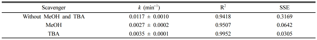 Fe(II)/PS/ECO에 의한 2,4-D 처리에서 주요하게 작용하는 라디칼을 확인하기 위해 메탄올과 TBA를 scavenger로 이용하여 실험을 수행하였다. 메탄올은 수산화 라디칼(1.2 – 2.8 × 109 M-1s-1)과 황산 라디칼(1.6 – 7.7 × 109 M-1 s-1)과의 반응에서 비슷한 반응속도상수를 가지는 반면, TBA는 수산화 라디칼과의 반응속도상수(3.9 – 7.6 × 108 M-1s-1)가 황산 라디칼과의 반응속도상수(4.0 – 9.1 × 105 M-1s-1)보다 훨씬 높게 나타난다(Bu et al., 2016; Cai et al., 2018). 그러므로 메탄올은 황산 라디칼과 수산화 라디칼의 scavenger로 사용하였으며, TBA는 수산화 라디칼의 scavenger로 사용하였다. 앞선 실험 결과를 통하여 도출한 최적 조건, 2,4-D 농도 1 mM, 전해질 Na2SO4 농도 10 mM, 과황산 농도 10 mM, Fe(II) 농도 5 mM 그리고 전류밀도 8 mA/cm2에서 실험을 수행하였다. Scavenger로 사용된 메탄올과 TBA는 각각 1 M로 하여 실험하였고(Cai et al., 2018), 실험결과는 Fig. 7과 Table 4에 나타내었다. 실험 결과 메탄올과 TBA를 주입하였을 때 2,4-D의 제거율이 92%에서 각각 51%, 67%로 감소하였으며, 속도상수 변화 정도(R (%), 식 (14) 참조)는 메탄올을 주입하였을 때 –78%, TBA를 주입하였을 때 –70%로 큰 차이가 없는 것으로 나타났다. 이 결과를 통하여 수산화 라디칼이 이 반응에서 주요한 라디칼임을 확인하였다.