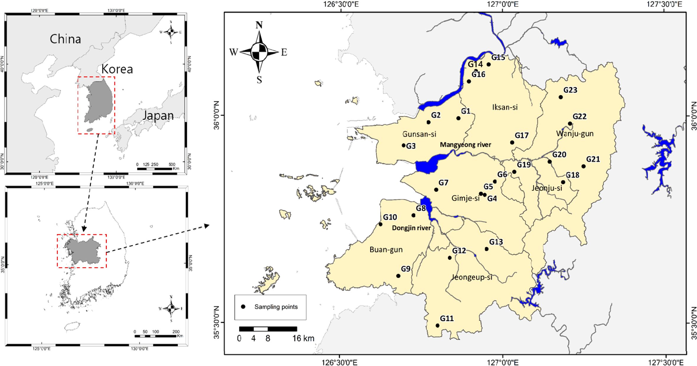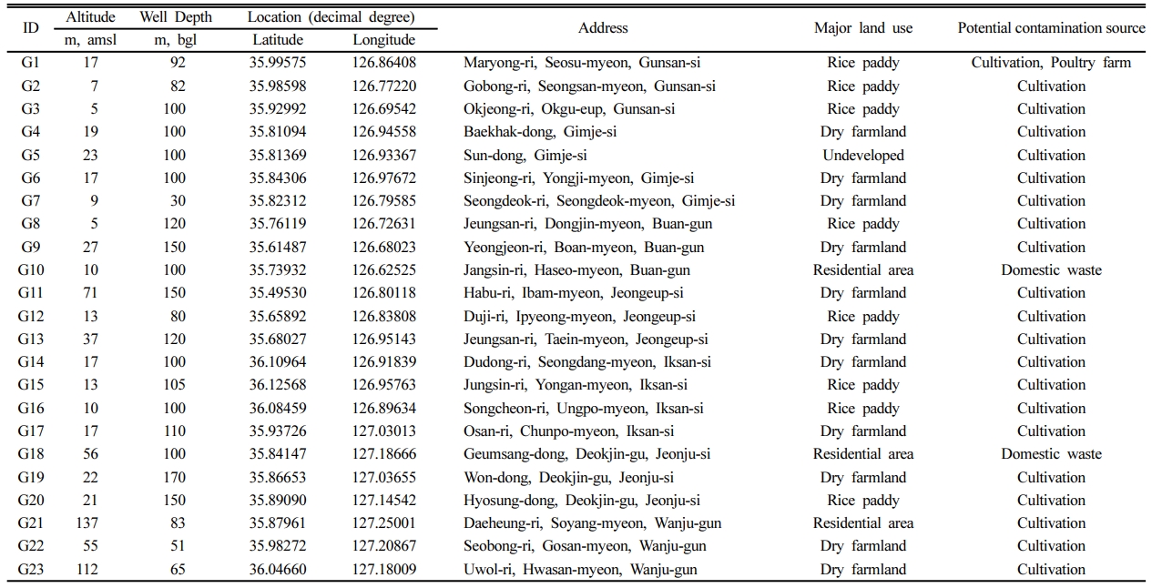 연구지역은 한국 남서부의 호남평야 일대이며 해안과 맞닿아 있는 군산, 김제, 부안과 내륙에 위치한 익산, 전주, 완주, 정읍의 7개 시군을 아울러(35.495~36.126°N, 126.625~127.250°E) 약 3,595 km2의 면적을 가진다(Fig. 1). 연구지역의 동쪽으로는 노령산맥이 위치하여 덕유산과 마이산이 지형경계를 이루고, 서쪽경계로는 서해가 위치하여 동고서저의 지형을 이룬다. 북쪽으로 금강이 흘러 유역경계를 나누고, 남쪽으로는 노령산맥을 따라 전남과 전북이 구분되어 수계유역이 명확하게 구분되는 특성을 가진다. 연구대상 관정의 위치, 심도, 토지이용 현황 및 관정반경 500 m 이내 거리에 위치한 잠재적 오염원을 Table 1에 정리하였다.