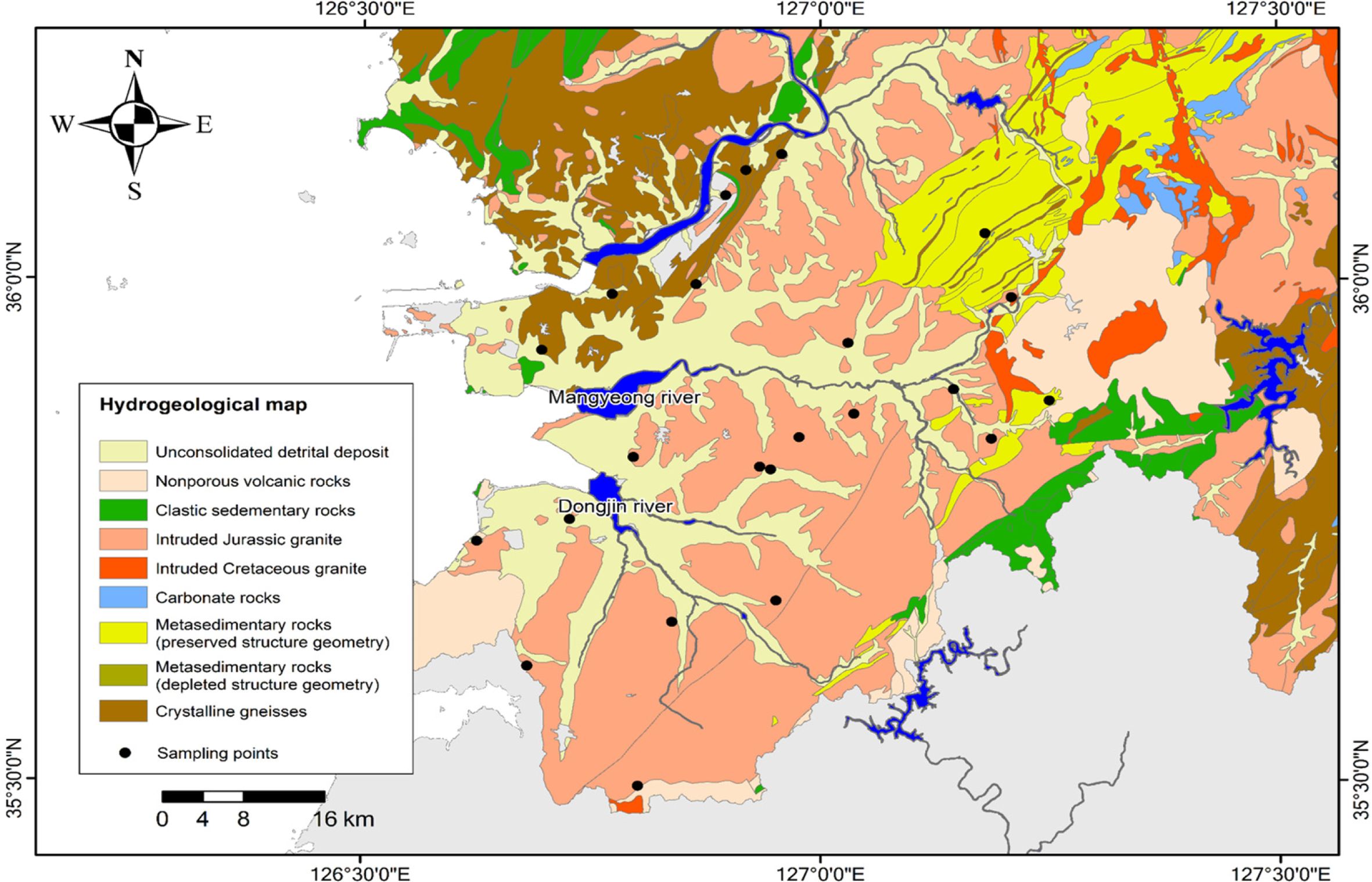 연구지역의 일반지질은 Fig. 2와 같이 나타나며 이 연구에서는 9개의 수문지질 단위(결정질 편마암류, 백악기 화강암, 트라이아스기와 쥬라기 화강암, 미고결 쇄설성 퇴적층, 퇴적구조가 보존된 변성퇴적암, 퇴적구조가 보존되지 않은 변성퇴적암, 비다공질 화산암, 쇄설성퇴적암, 탄산염암)로 구분하여 제시하였다(KIGAM, 2020). 군산시와 익산시는 원생대 편마암과 이를 관입한 중생대 화강암류 저반이 발달해 있으며, 부안군과 완주군은 변성암과 화강암 기반 위에 백악기 퇴적암과 화산암이 이를 관입 혹은 분출하는 복잡한 양상을 보인다. 전주시, 김제시, 정읍시는 길게 화강암 기반암이 위치하고 있으며 풍화된 화강암이 노년기 지형을 이루고 있다(Hong et al., 1969; Kim et al., 2012a; Kim et al., 2012b; Choi and Hwang, 2013; Song et al., 2013). 지평선이 존재하는 호남평야의 평탄한 지형특성은 화강암 기반암이 해수면 높이까지 침식이 이뤄진 후 신생대 4기 퇴적층이 넓게 충적되어 있기 때문으로 밝혀진 바 있다(Kim et al., 2012b; Song et al., 2013). 만경강과 동진강 하류의 충적평야를 제외한 대부분 지역은 준평원 지형을 이루고 있으며, 군산시와 부안군 일대는 토탄과 식물화석이 부존하는 것으로 보고되어 과거 산림이나 잡초로 덮여 있었던 것으로 추정된다(Choi and Hwang, 2013).