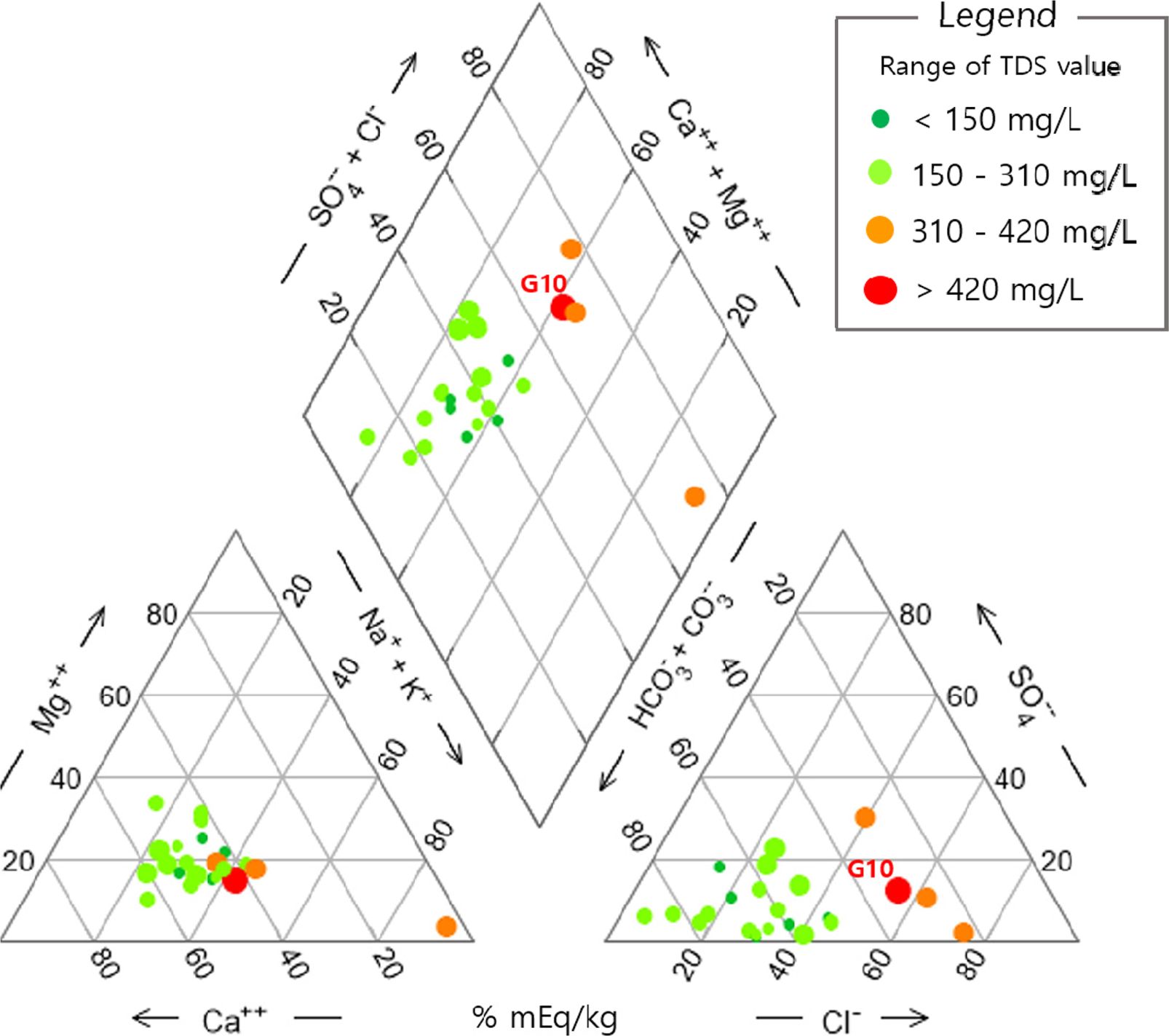지하수의 현장측정 값에서 수온은 14.6-17.2oC(평균 15.8oC, 표준편차 0.65oC), pH는 6.26-7.95(평균 6.83, 표준편차 0.47), EC가 203-1295 μS/cm(평균 336 μS/cm, 표준편차 231 μS/cm)로 분포한다. 이는 연구지역 지하수의 수온과 pH가 일정하게 유지되고 있으나 EC값은 샘플 채취 지역별로 큰 차이를 가지는 것을 보인다. 이는 연구지역이 해안에 위치한 농업지역으로 심부관정 지하수와 해수의 혼합이 일부 있기 때문으로 해석할 수 있으며, 천부지하수의 경우 농업활동에 의해 용존 성분이 상승하였을 가능성이 있다. 지하수의 수질화학특성을 상세히 살펴보고자 샘플들의 주요이온 성분을 사용하여 파이퍼 다이어그램에 도시하였다(Fig. 3). EC에 대응하여 TDS(Total dissolve solids, 총용존고형물) 역시 이 지역의 지하수에서 큰 편차를 보였다(평균 251 mg/L, 표준편차 148 mg/L). 지하수 수질에 영향을 미치는 유입인자와 수질변동 특성을 해석하고자, TDS값을 기준으로 4단계로 나누어 색깔 및 크기로 구분하여 파이퍼 다이어그램에 도시하였다.