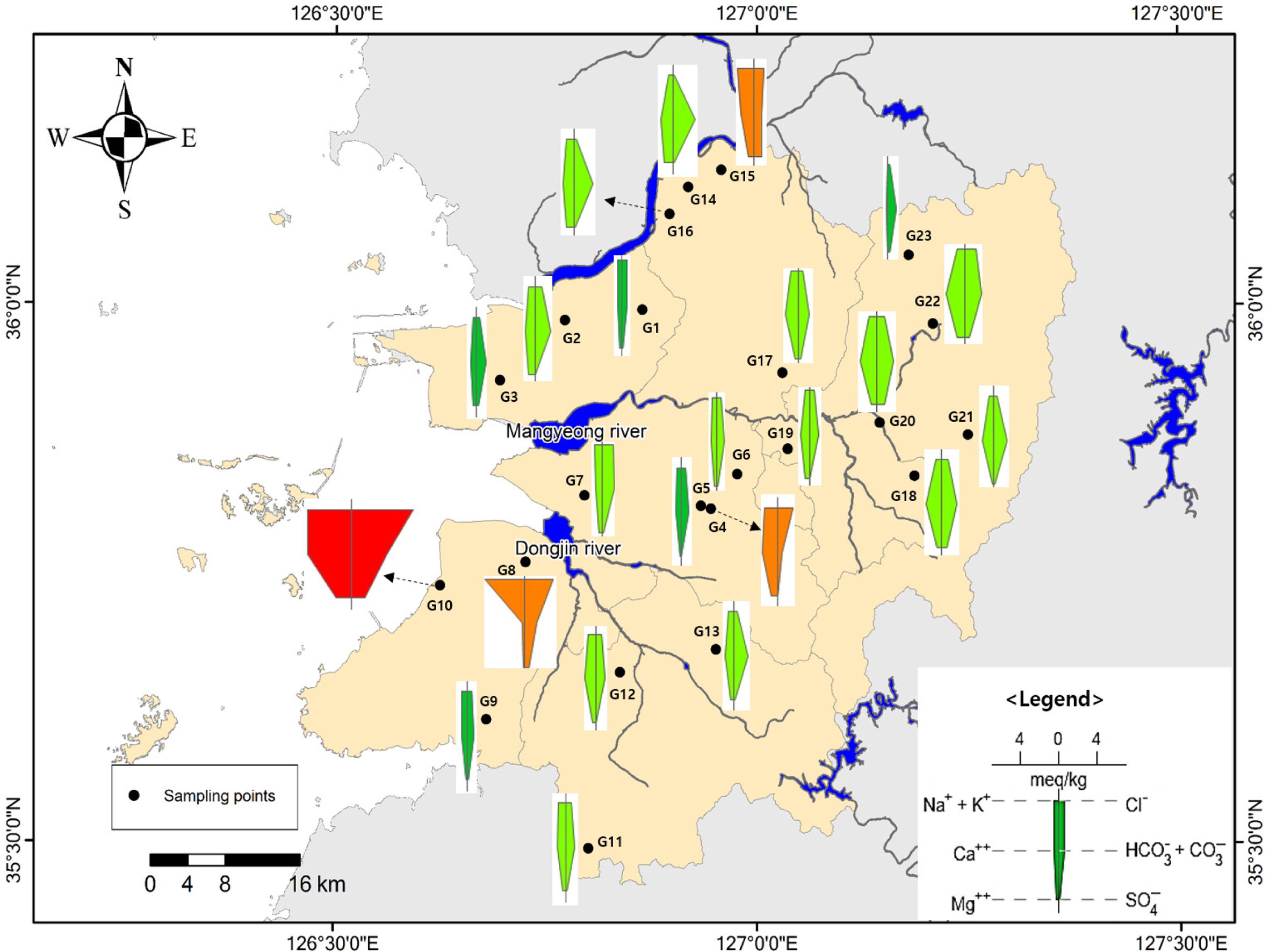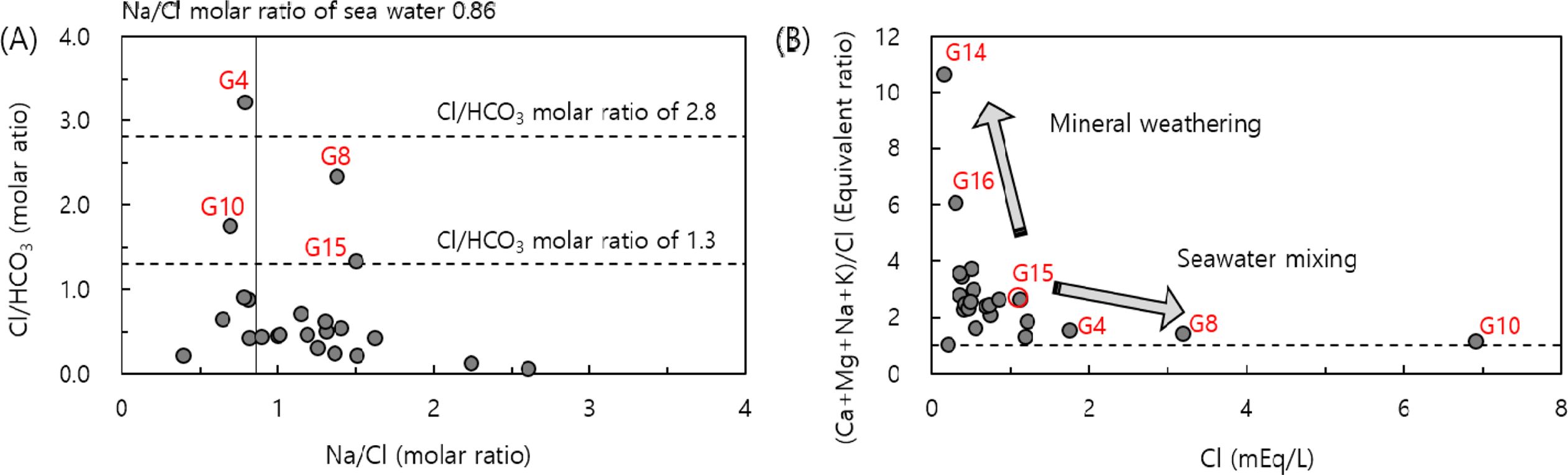 Cl/HCO3 몰비를 기준으로 하여, 2.8 이상의 값을 가져 심각한 수준의 해수오염의 영향을 고려해야 하는 G4 관정은 해수의 Na/Cl 몰비에 가깝게 나타난다. 1.3 이상의 Cl/HCO3 몰비를 가지는 3개 관정은(G8, G10, G15) 해안 혹은 하구와 인접한 장소에 위치하고 있어 해수 혼합과 농업활동의 영향이 어느 정도 혼합되어 나타나는 것으로 여겨진다.