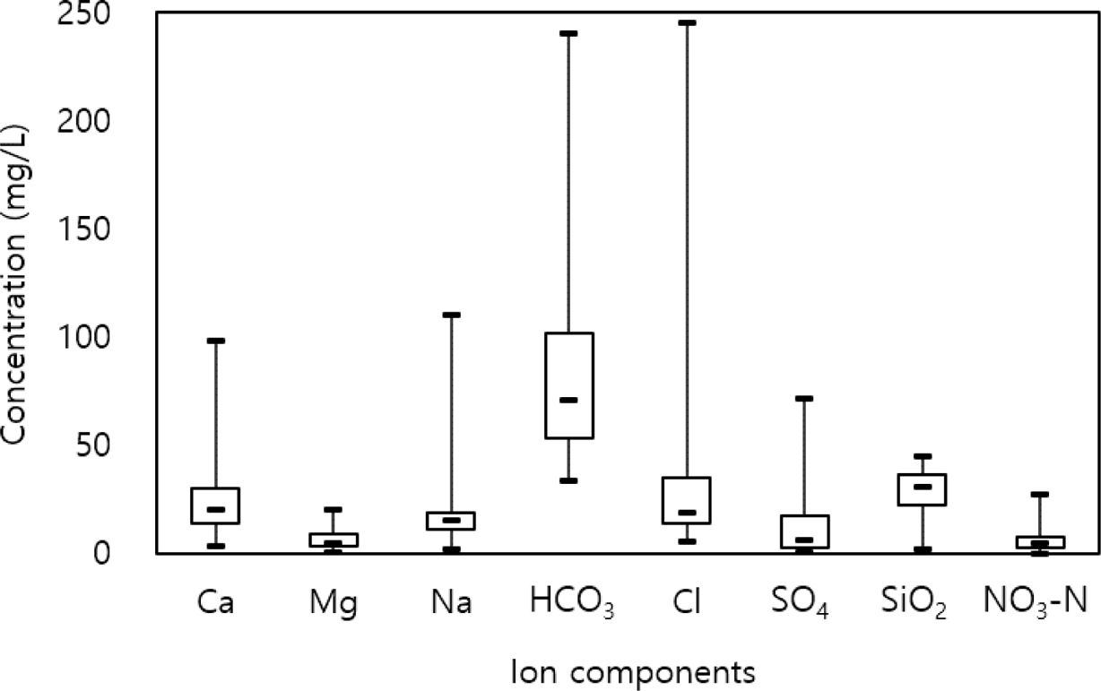 상자 수염 그림(Box-whisker plot)을 이용하여 주요이온 성분들의 최소값, 최대값, 25백분위수(Q1)와 75백분위수(Q3), 중앙값을 도시한 그림은 Fig. 5와 같다. 연구지역 지하수 주요성분 가운데 Na-Cl 그리고 Ca-HCO3 이온 성분이 특히 넓은 농도범위에 분포하고 있는 것이 보인다. Na이온과 Cl이온, SO4이온의 중앙값은 낮은 농도에 위치하고 있으며 2사분위와 4사분위 역시 낮고 좁은 범위에 위치하고 있어, 일부 고농도 샘플이 전체 농도분포에 영향을 미치는 것으로 판단된다. Ca이온은 2사분위와 4사분위가 상대적으로 높게 위치하여 상대적으로 고른 농도분포를 가지는 것으로 보인다. 먹는물 기준의 질산성질소 농도를(10 mg/L 이내) 초과하는 지하수 샘플은 전체 샘플의 17%에 해당하며, 나머지 19개 샘플의 중앙값은 3.46 mg/L NO3-N으로 일부 해수침투 관정을 제외하면 생활용수 및 농업용수로 활용하는 사용목적에 부합할 것으로 여겨진다(ME, 2021).
