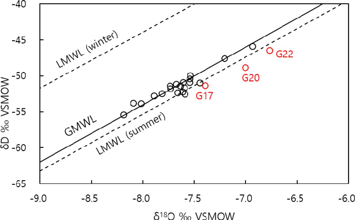 연구지역 대부분의 지하수는 순환수선과 지역순환수선 사이에 분포하여 강수기원임을 보이며, 일부 시료는 증발의 영향을 받아 동위원소 값이 부화된 것으로 여겨진다(Fig. 6의 빨간 표식).