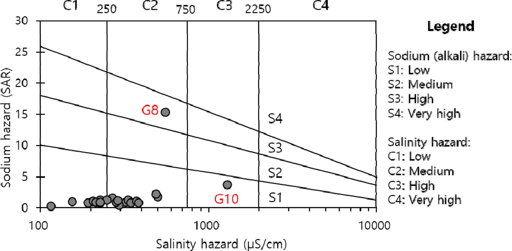 C3-S1 영역의 지하수가 산출되는 관정은 (G10샘플) 나트륨 집적도가 낮아 양이온 교환은 거의 일어나지 않을 것으로 여겨지나, 염도가 brackish water의 범위로 높아, 배수가 잘되는 토양에서 내염성 작물(salt tolerance crop)을 재배하는 것을 권장한다(Gupta et al., 2009). 이에 근거하여 USSL다이어그램에 도시한 연구지역의 지하수는 대부분이(약91%) S1-C1과 S1-C2 클래스에 분포하여 낮은 알칼리와 중간 이하의 염류집적도를 가지는 것을 보인다.