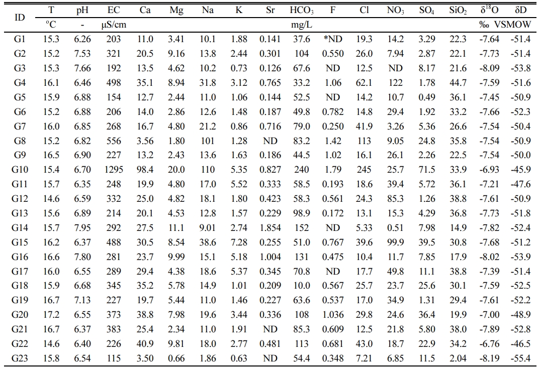 연구지역에서 지하수 관정이 위치한 고도는 해발 5-150 m 사이로 해안평야와 구릉지에 해당하며, 연구대상 관정은 30-170 m 사이의 심도를 가진다. 2019년 10월 갈수기시기에 연구지역의 각 시군별로 3-4개의 지하수 샘플을 채취하여 총 23개 관정을 활용하여 기초적인 지하수 수질특성을 확인하고자 하였다. 현장에서의 수온, pH, EC(Electrical conductivity, 전기전도도)는 WTW Multi 3620 IDS set C를 이용하여 측정하였으며, 이온분석 및 알칼리도 측정을 위해 채수 즉시 0.45 μm 필터지에 걸러 농질산으로 전처리(양이온 샘플)하여 냉암소에 보관하였다. 양이온 분석은 유도결합 플라즈마 분광광도계(ICP, Optima 7300 DV, Perkin Elmer), 음이온분석은 이온교환 크로마토그래피(ICS-1500, Dionex), 안정동위원소 분석은 WS-CRDS분석기(L2120-i, Picarro)를 사용하였다. 지하수 샘플의 현장 측정값, 이온 분석값, 산소-수소 안정동위원소 분석값은 Table 2과 같다.