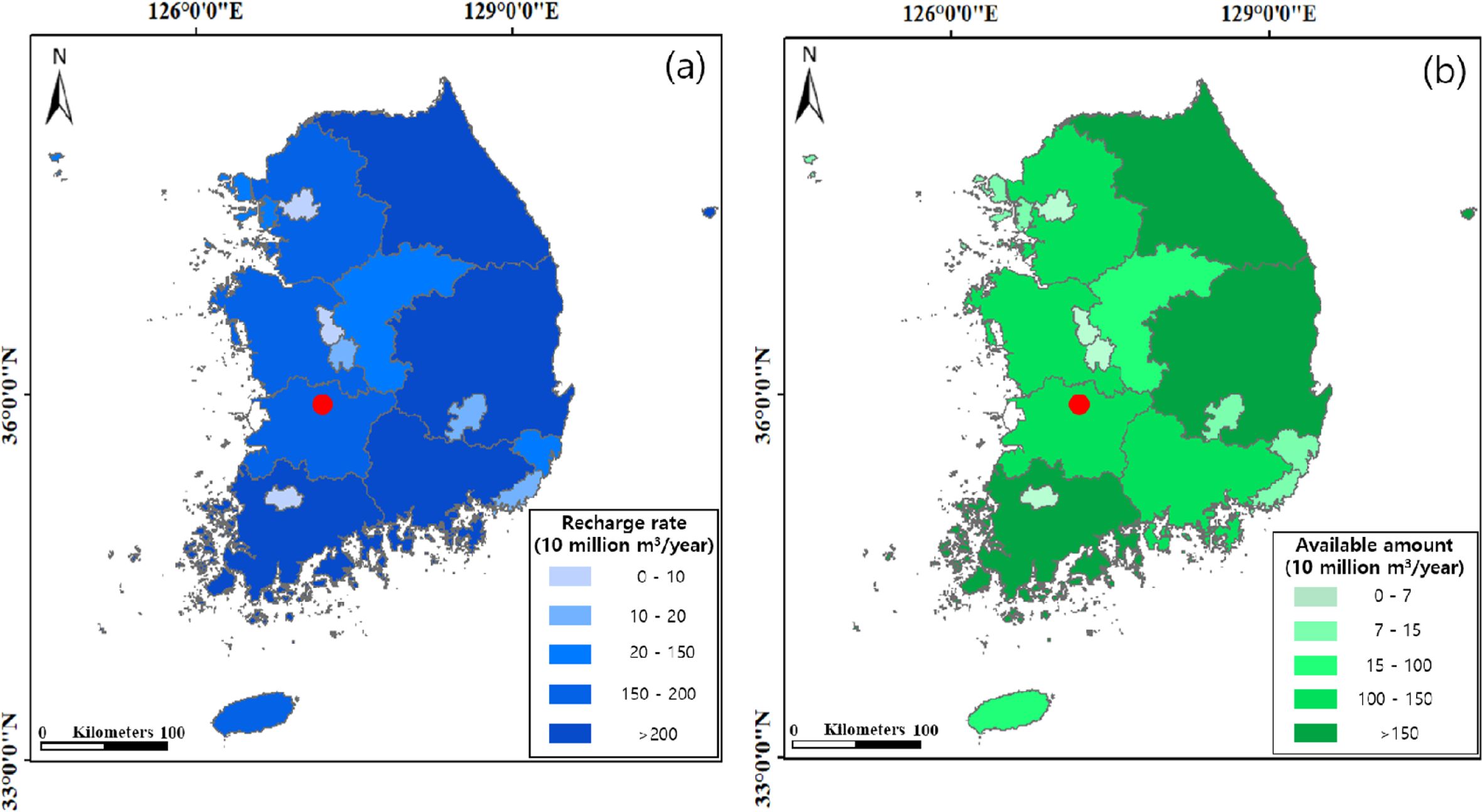 Fig. 1 Recharge rate and available amount of groundwater in South Korea. The location of study site is marked with a red point. |
