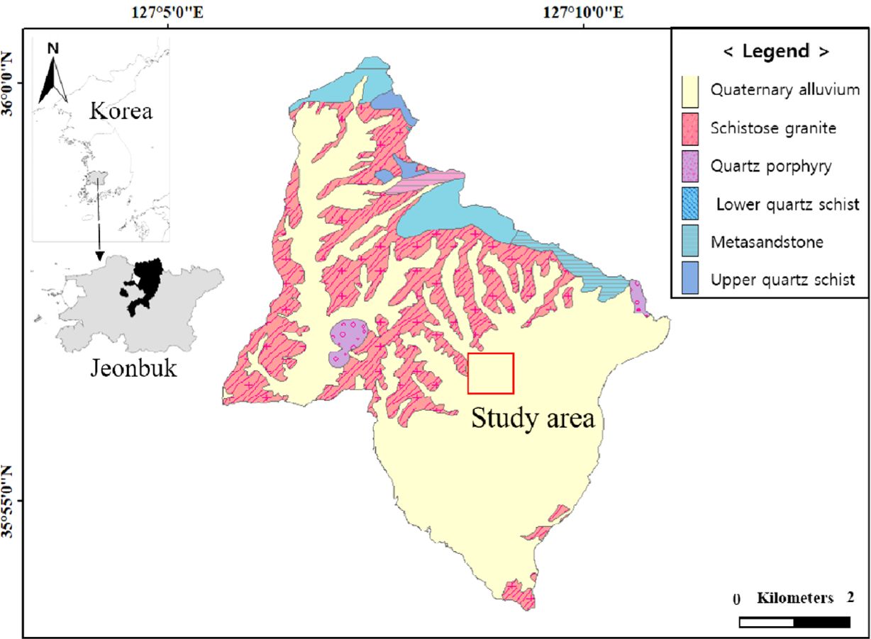연구지역은 전라북도 완주군 봉동읍 일대의 화훼재배 단지로서, 10년 평균기온은 13.8oC, 10년 평균강수량은 103.42 mm의 온난다습한 기후를 가진다(KMA, 2021). 연구지역의 북쪽에는 봉실산(372 m), 남서쪽에는 서방산(617 m)이 위치하고, 이 두 산을 제외하면 대부분 낮은 구릉성 산지와 충적평야가 분포한다(Hwang et al., 2009). 연구지역 인근에는 우산천이 충적평야를 가로지르며 북동쪽에서 남서쪽으로 흐르고, 동쪽에서 서쪽방향으로 흐르는 만경강과 남서쪽에서 합류한다. 연구지역의 지질은 고생대 옥천층군에 속하는 변성암류가 북쪽의 봉실산 주변으로 분포하며, 쥬라기 화강암이 연구지역 서편에 분포한다(Hong and Kim, 1969; Hwang et al., 2009). 연구지역의 동쪽과 남쪽은 제4기 충적층이 넓게 분포한다(Fig. 2). 이는 선상지성 충적평야로 분류되며, 하안단구 자갈층 위에 실트층이 퇴적되어 투수성이 좋은 천부 대수층의 발달 조건을 갖추고 있다(Jo, 1987). 노두에서 확인된 퇴적층은 약 5 m의 두께를 가지며, 퇴적층의 하부는 하안단구 역층 위에 뢰스-고토양 연속층이 퇴적되어 나타난다(Hong and Kim, 1969).