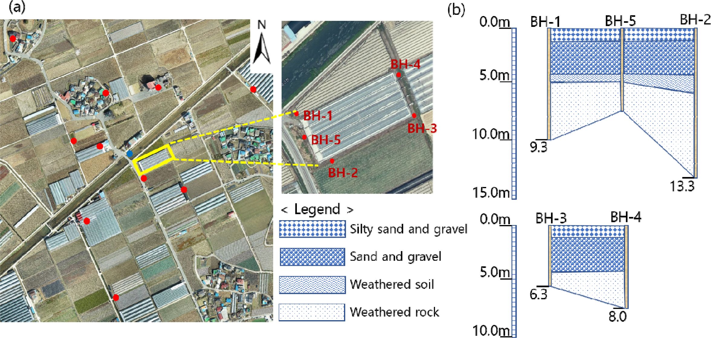 연구대상부지는 온실을 설치하여 혹한기 및 혹서기를 제외한 연중 작물의 재배 및 출하가 이루어지고 있으므로, ATES 시스템이 항온 유지에 도움이 될 것으로 사료된다. Fig. 3과 같이 후보부지의 전면과 후면에 5개의 시추공을 착정하여 퇴적층의 물성과 대수층의 두께를 관찰하였다. 해당 부지 주변의 충적대수층은 두께가 5 m부터 10 m 사이로 관찰되며, 이는 ATES 기법 가운데 중소규모의 재순환공법을 적용하기에 적합한 부지로 판단된다.