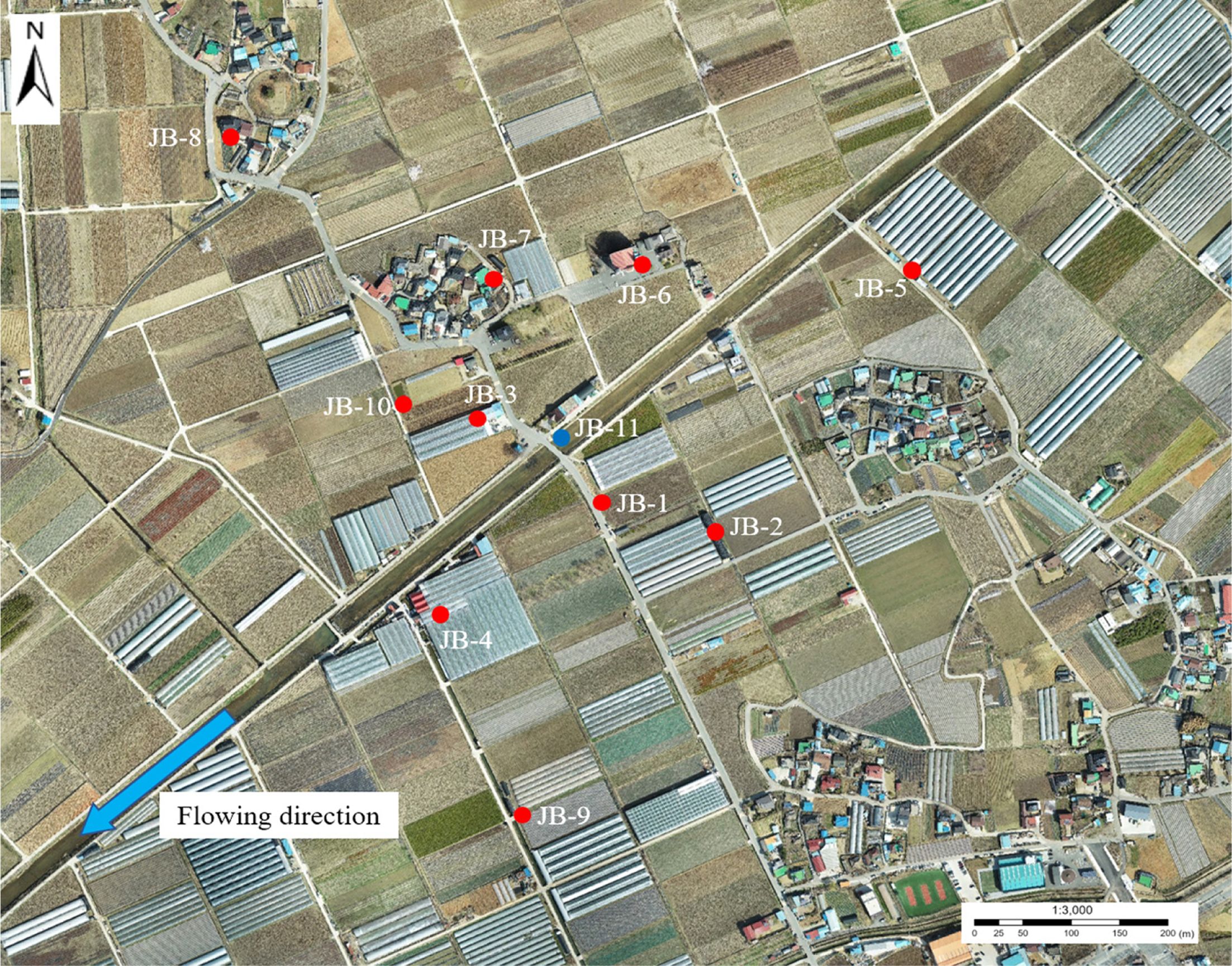Fig. 4 Red dots and blue dot represent sampling points of groundwater and surface water, respectively. The surface water flows to the southwest direction (Blue arrow). |