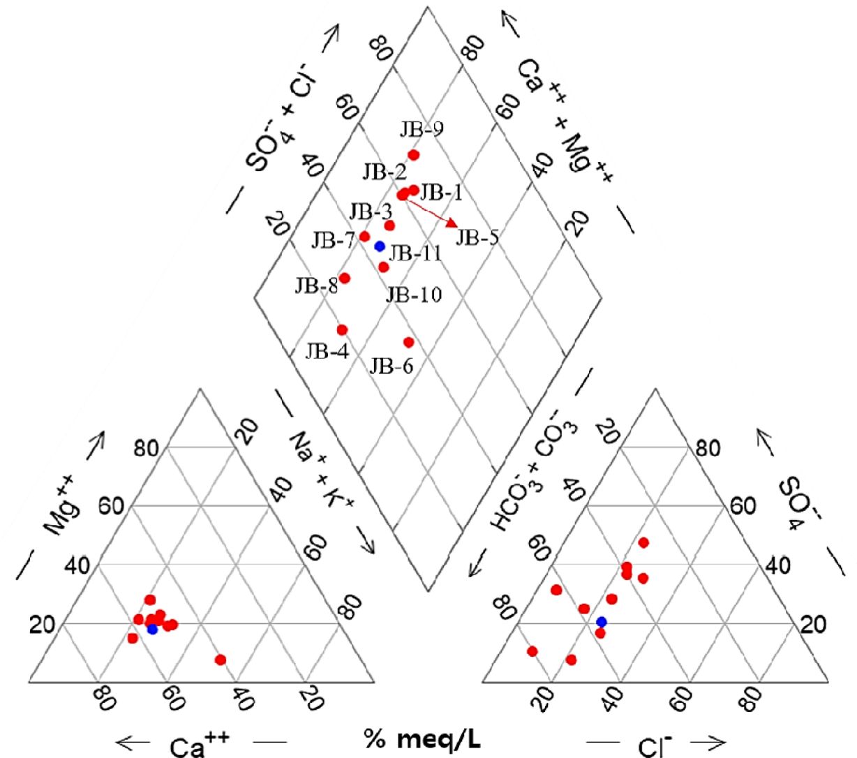 Fig. 5 Piper diagram using major cation and anion composition of water samples in this study site. The red dots and the blue dot represent the mean of groundwaters and the surface water, respectively. |