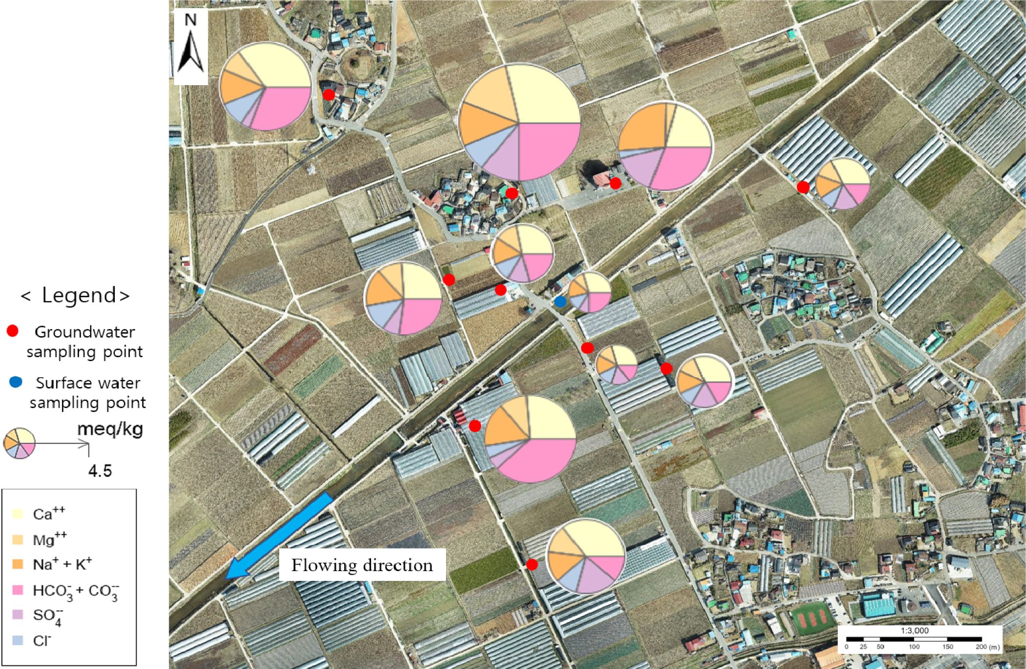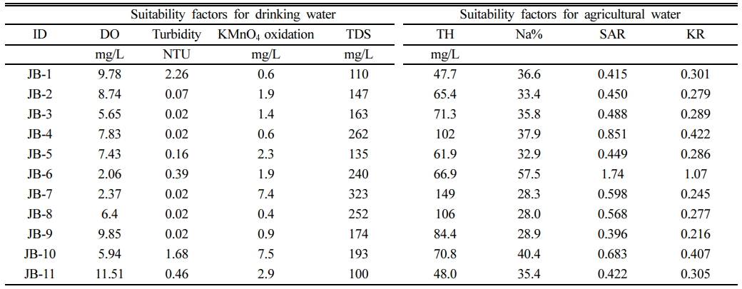 앞서 언급한 것처럼, 연구지역의 지하수는 대부분 생활용수 및 농업용수로 활용되고 있으므로 지하수 및 지표수의 수질인자가 활용목적에 부합하는지 판단하고자 하였다. 지하수 수질특성 평가를 위해 한국의 먹는물 수질기준 가운데 일부 항목인 건강상 유해영향 무기물질(불소 및 질산성질소)과 심미적 수질기준(과망간산칼륨소비량, 염소이온, 탁도)과 농업용수 적합도 평가인자(경도 및 치환성양이온 조성)를 활용하였다(Table 2).