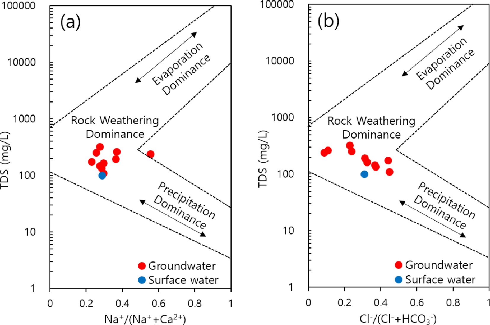 깁스다이어그램은 지하수의 수리화학특성을 결정하는 주된 인자가 어떤 기작인지 보여주는 간단한 그림으로, 양이온과 음이온에 대한 두 개의 세미로그 다이어그램(TDS와 Na+/(Na++Ca2+), TDS와 Cl-/(Cl-+HCO3-))위에 시료를 도시한다(Gibbs, 1970). 깁스다이어그램을 통해 판단할 수 있는 주된 수질결정인자는 증발영향, 물-암석반응, 강수에 의한 희석이 있다. 연구지역의 수리화학은 주로 기반암과의 반응에 의해 결정되는 것으로 보이며, 강수 구간에 일부 시료가 도시되는 것을 통해 광물로부터 용출된 이온성분들이 강수에 의해 희석되었을 것으로 판단된다(Fig. 7).