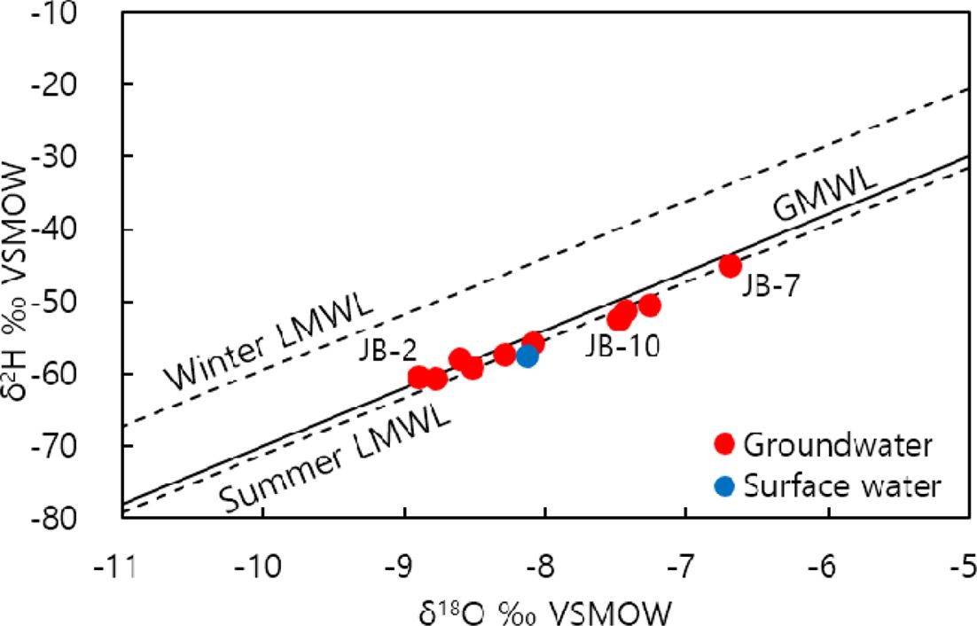 연구지역의 지하수와 지표수는 순환수선(Global Meteoric Water Line, GMWL)상에 도시되어 순환수의 특성을 보여준다(Craig, 1961). 한국의 지역순환수선(Local Meteoric Water Line, LMWL)을 함께 도시하였을 때(Lee and Lee, 1999), 연구 지역의 지하수는 주로 여름의 강수에 의해 함양되는 것으로 보인다. Fig. 8에 도시한 각 순환수선 식은 다음과 같다.
