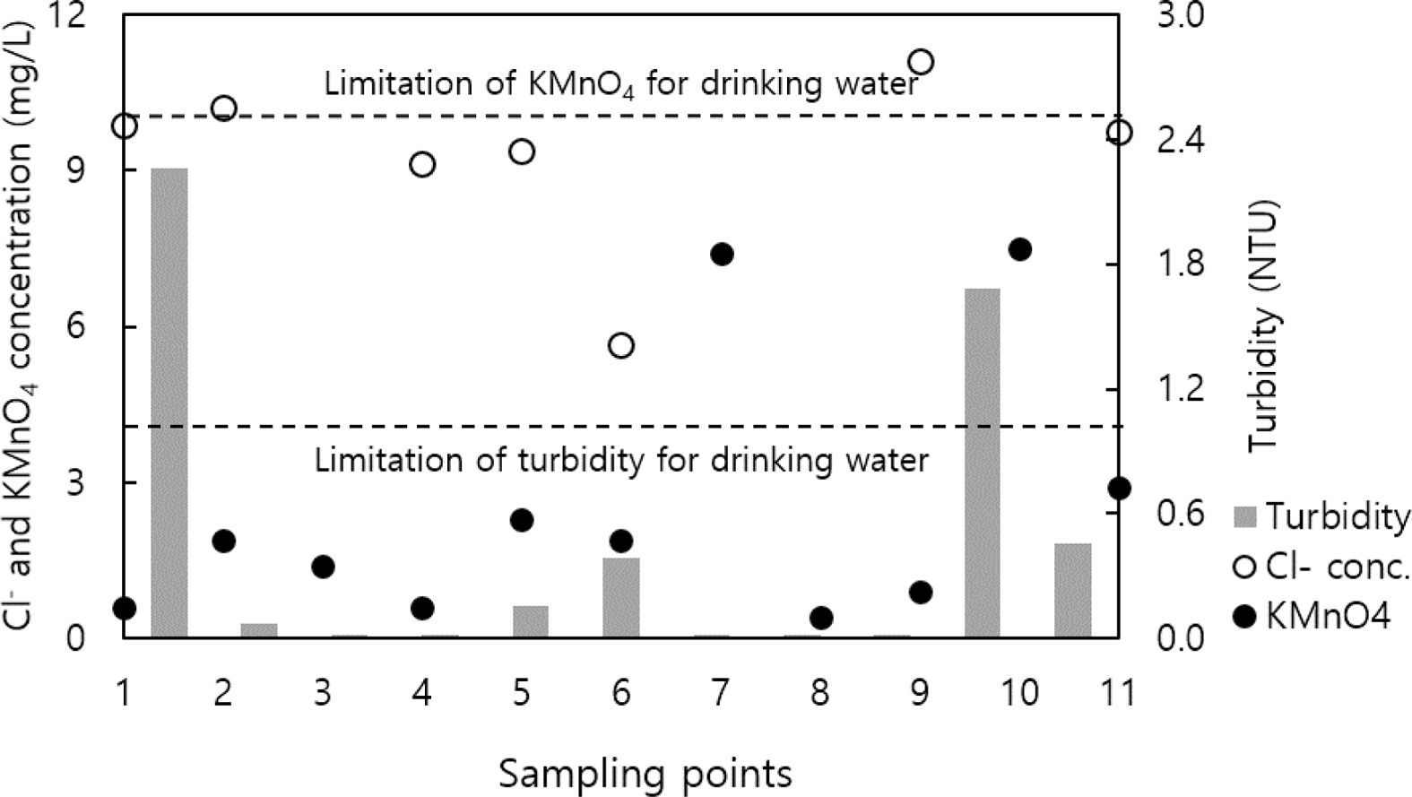 심미적 수질기준에서 과망간산칼륨(KMnO4)소비량은 지하수에 용존하는 유기물 및 Fe2+, SO32-, NO2- 등의 무기물이 과망간산칼륨을 소비하는 양으로서, 토양 중의 휴믹물질(낙엽 혹은 동식물의 사체에서 발생)을 다량 함유한 물과 하수, 그리고 공장배수 등이 유입된 경우 소비량이 증가한다(Krupiñska, 2020). 먹는물 수질기준에서는 과망간산칼륨소비량이 10 ppm 이내로 나타나야 하는데, 연구지역에서는 JB-7과 10지점이 기준치를 벗어나는 것으로 측정되었다(Fig. 9). JB-7지점은 NO3-농도도 높게 나타나 인근 생활하수의 혼입을 의심해야 할 것으로 여겨진다. JB-10지점은 토끼와 닭 등의 가축을 키우고 있어 가축분뇨 등이 유기물질 오염원으로 작용하였을 것으로 여겨진다. 탁도에서도 JB-10 지점은 기준치를 넘어서는 것(1 NTU 이내)으로 관측되었다. 추가적으로 JB-1지점에서도 높은 탁도가 관찰되었는데 이는 테스트베드 지점으로, 모니터링 3일 전 시추한 영향 때문에 일시적으로 탁도가 높아진 것으로 생각된다. 음용수로 사용할 경우 물맛에 영향을 미치는 Cl-의 농도는 기준치 250 mg/L에 비해 매우 낮게 나타나 순환수의 특성이 반영된 담수임을 알 수 있다(Fig. 9).
