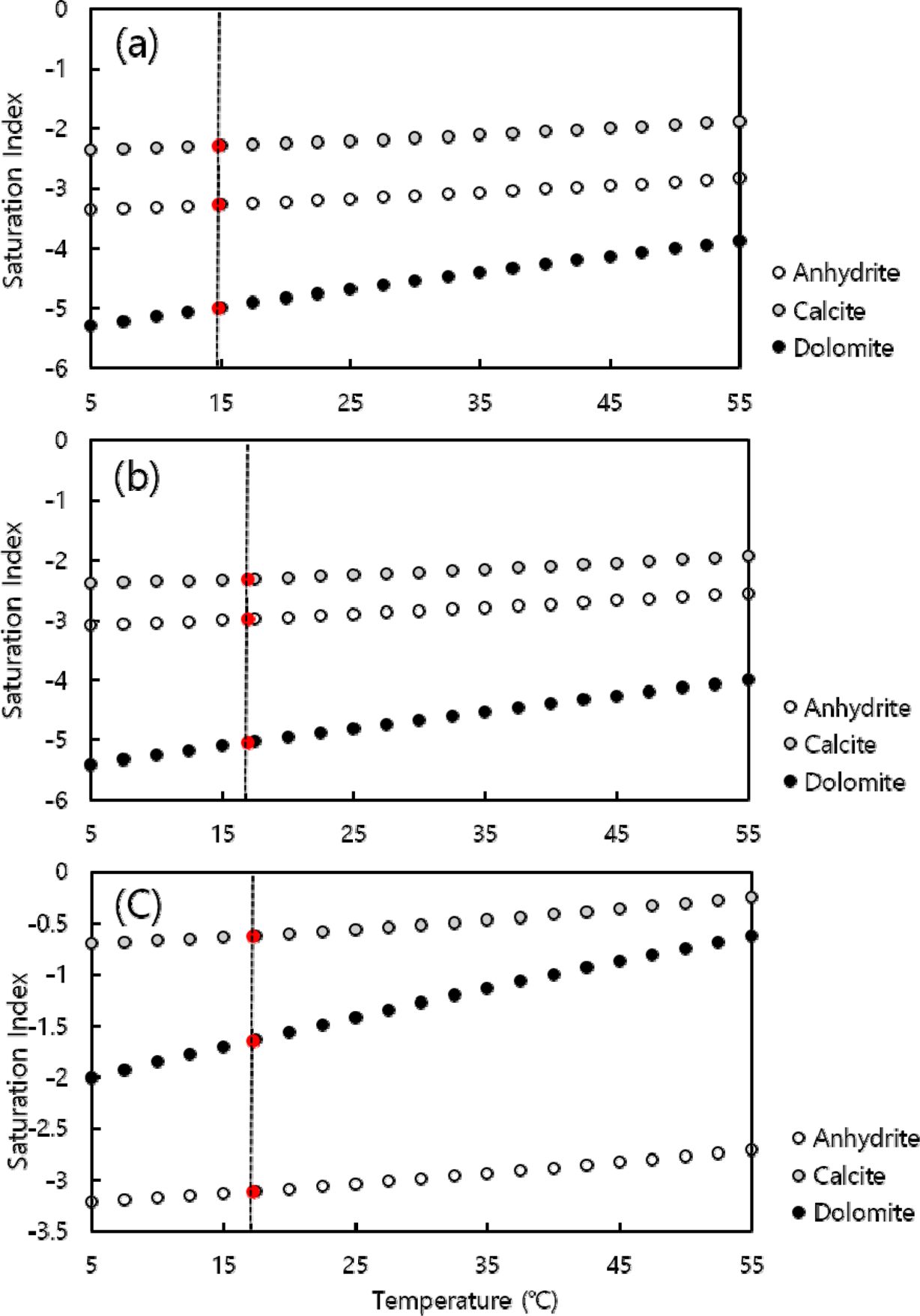 Fig. 10 Saturation index (SI) of JB-1 (a), JB-2 (b), and JB-4 (c) sites with respect to anhydrite, calcite, and dolomite. The dotted line and red dot show an initial sampling temperature and saturation index for initial water at each sampling site, respectively. |