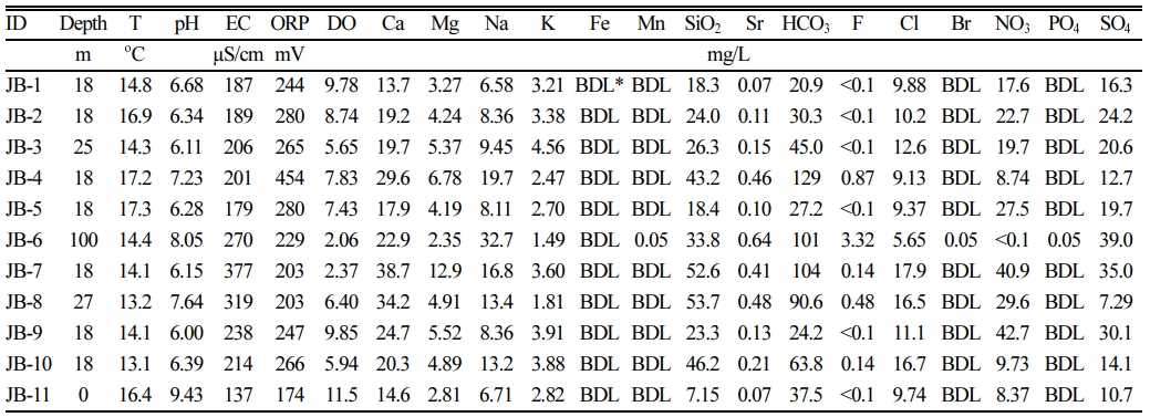 연구지역 지하수 시료의 수온은 평균 15.1oC로 10년 연평균 기온(13.8oC)에 비해 조금 높게 나타났으며, 천부대수층의 지하수가 기온의 영향을 받아 수온 상승이 이루어진 것으로 판단된다(Table 1). JB-4와 5지점은 지표수(JB-11)보다 높은 수온을 가지는 것으로 측정되었다. 이는 지표수와 지하수의 시료채취 시간이 정오(11시경부터 2시경)와 늦은 오후(5시경)였기 때문에 지표수가 주변 대기 온도와 평형을 이루었기 때문으로 여겨진다. 또한 해당 지점은 비닐하우스 안에 설치된 관정에서 천부지하수를 채수하였기 때문에, 충분한 시간을 양수하였음에도 비닐하우스 내부의 복사열이 천부지하수의 수온상승에 일부 영향을 미쳤을 수 있다고 여겨진다. 연구 지역의 물 시료는 Ca-HCO3 유형부터 Ca-Mg-Cl-SO4 유형 사이에 분포하며 음이온의 조성이 연구지역 수질유형을 결정하는데 중요한 역할을 하고 있다(Fig. 5). 지표수가 천부지하수와 유사한 이온조성을 가진다는 점에서 연구지역 지표수와 지하수의 상관성이 높을 것으로 생각되며, 특히 Ca-Mg-Cl-SO4 유형의 시료는 강수의 영향을 받은 지하수 혹은 새롭게 함양된 지하수(fresh recharged water) 성분이 반영된 증거로 해석된다(Nazzal et al., 2014). 이에 비해 JB-6은 연구대상지에서 가장 깊은 심부지하수로서(굴착심도 100 m) 양이온 가운데 Na와 HCO3의 비율이 상대적으로 높게 나타나는 것이 관찰된다.