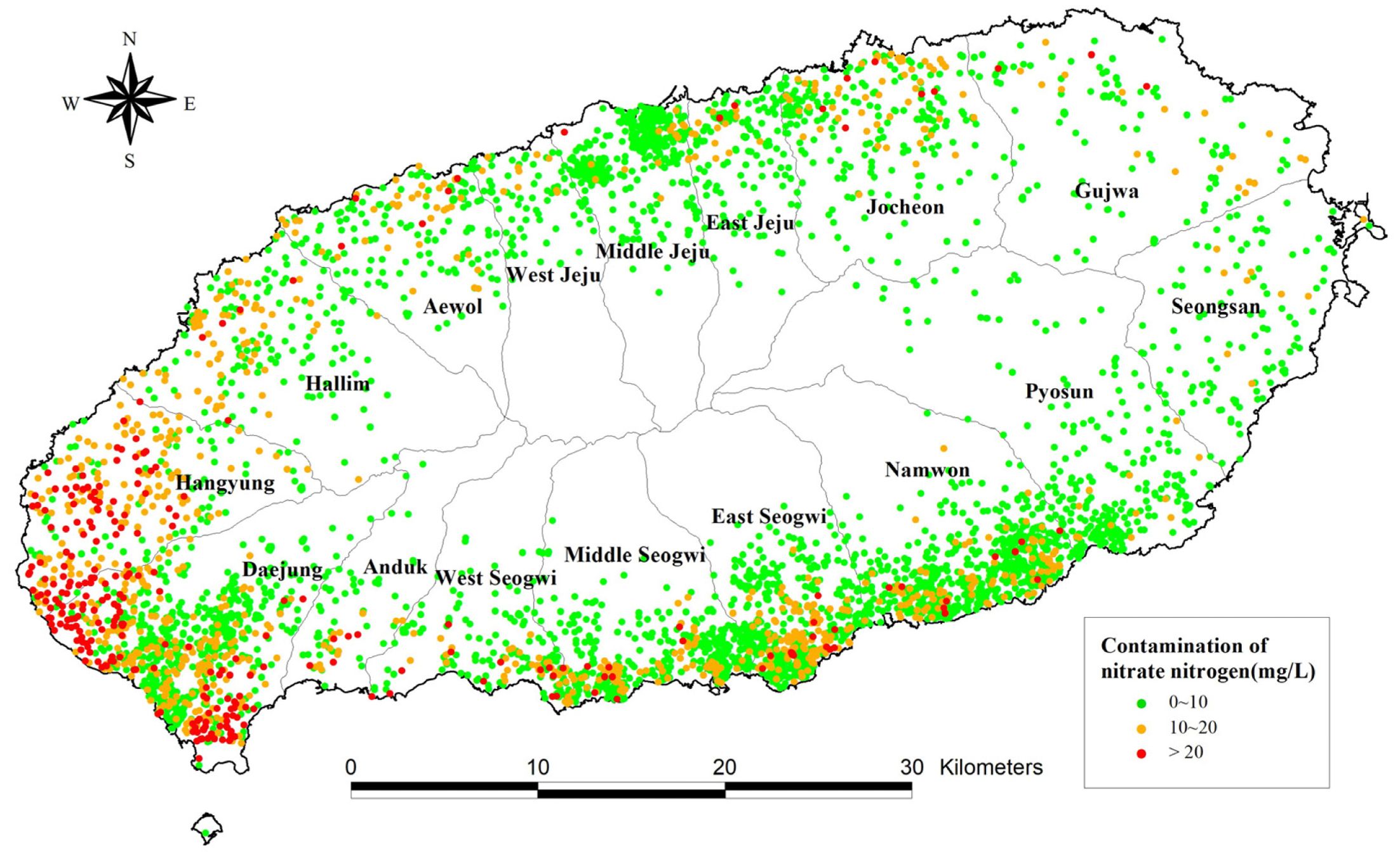 이러한 기준을 토대로 중 5,109개(원상복구 관정 및 자료누락 관정 제외) 시료에 대한 질산성질소 분석 자료를 이용하여 제주도 전역에 대한 오염현황을 분석하였다. 이 기간 중 가장 높은 질산성질소 농도는 대정유역의 사설관정에서 81.5 mg/L로 분석되었는데, 기간 중 10회의 분석결과에 대한 평균값은 42.4 mg/L로 심각한 수준의 오염이 발생된 것으로 나타났다. 또한 질산성질소 농도가 30 mg/L 이상으로 분석된 관정들은 대부분 대정유역 및 한경유역에 집중되어 분포하고 있다(Fig. 1).