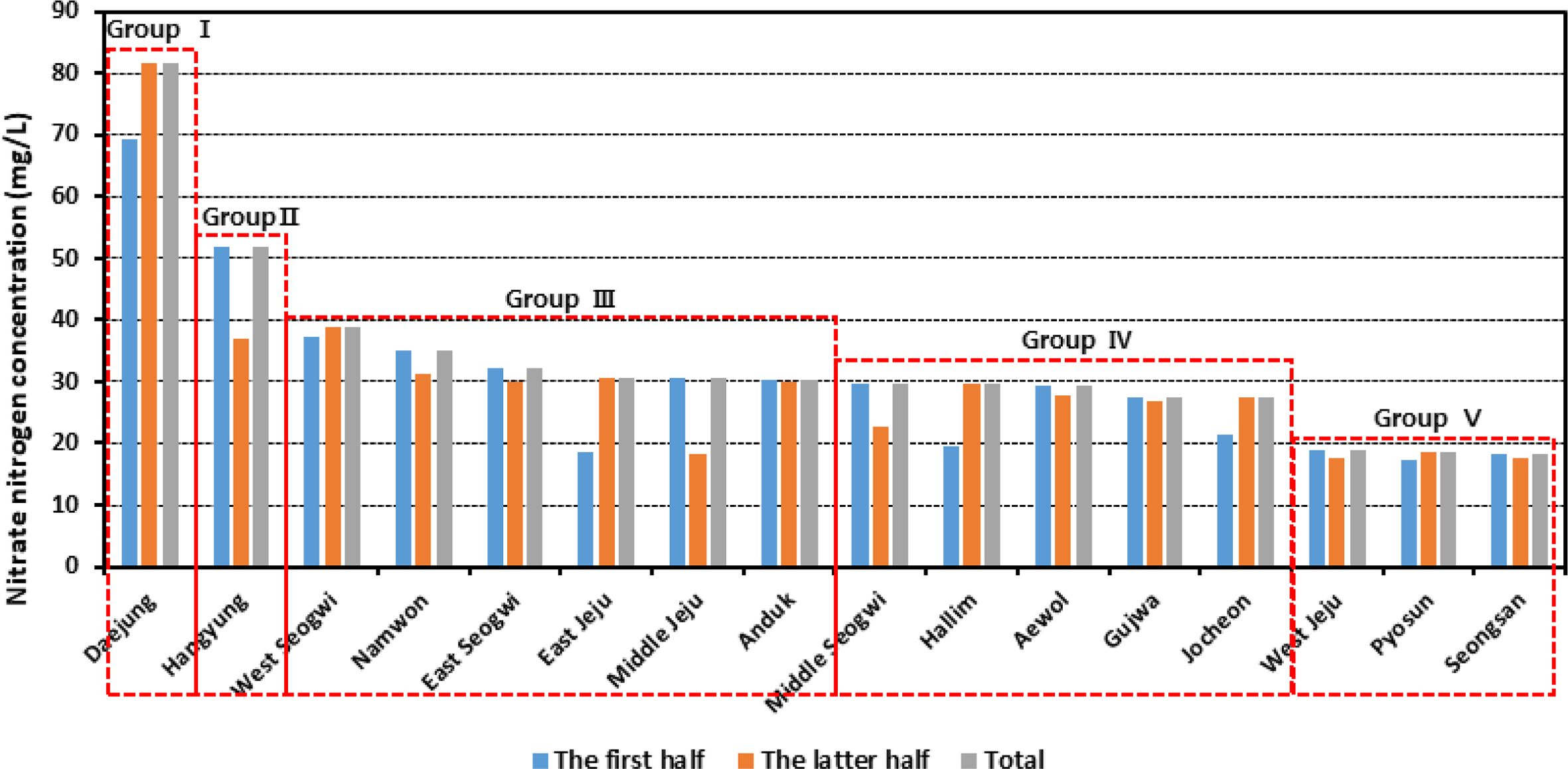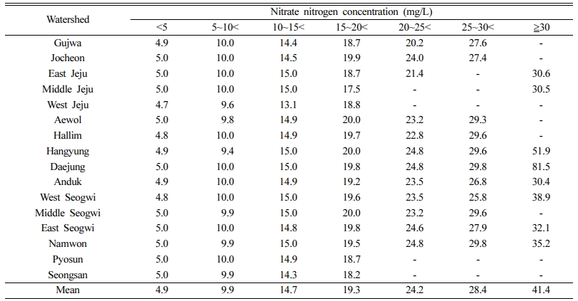 분석 기간 중 유역별 질산성질소 농도 최대값은 대정유역에서 81.5 mg/L로 가장 높게 나타났으며, 한경(51.9 mg/L)과 서서귀(38.9 mg/L) 순으로 분석되었다. 유역 특성에 따른 오염등급 설정을 위하여 전체기간 중 분기별 최대 농도값에 대하여, 중앙값(median)인 30 mg/L를 기준으로 구간별 편차가 적은 범위의 농도를 나타내는 5가지 그룹으로 구분하였다. 이를 토대로 구간별 최대 농도값을 20.0 mg/L 미만, 20.0~30.0 mg/L 미만, 30.0~50 mg/L 미만, 50.0~80 mg/L 미만, 80.0 mg/L 이상으로 세분하였다(Table 3, Fig. 2).