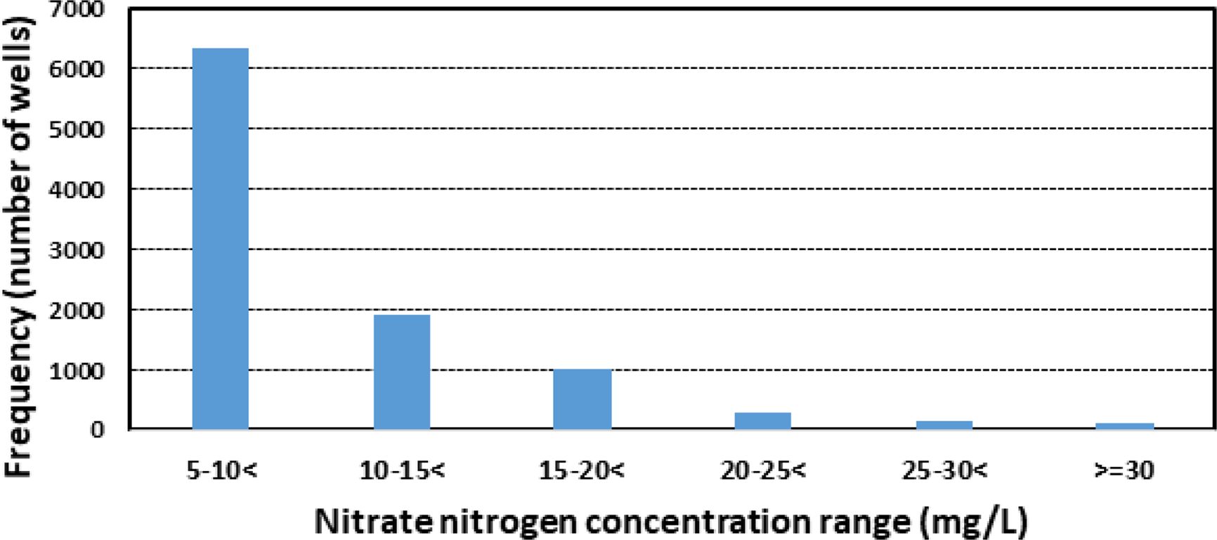 Fig. 4 Frequency distribution of wells in each nitrate nitrogen concentration range except less than 5 mg/L. |
