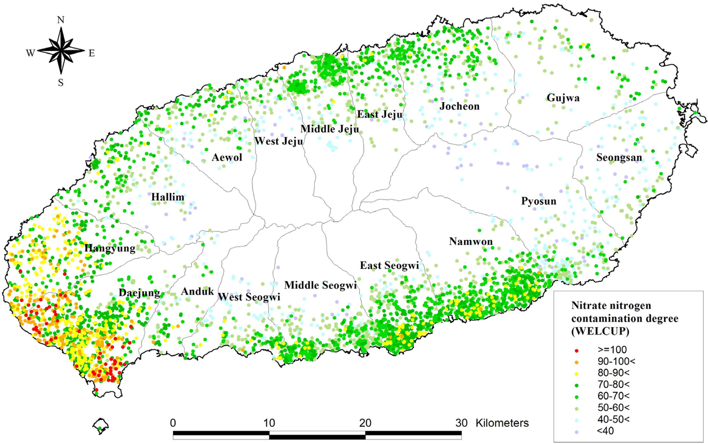 제주도 내 관정별 질산성질소 오염도 평가를 위해 고안된 WELCUP 기준을 적용한 지수는 최고 108, 최저 21점으로, 질산성질소 오염에 상대적으로 더 민감한 관정을 확인하는 것이 가능하다. 따라서 WELCUP 지수가 높을수록 질산성질소에 의한 지하수의 오염 가능성이 상대적으로 큰 반면, 지수가 낮을수록 오염 가능성이 상대적으로 적다는 상대적인 평가 도구로 활용이 가능하다.