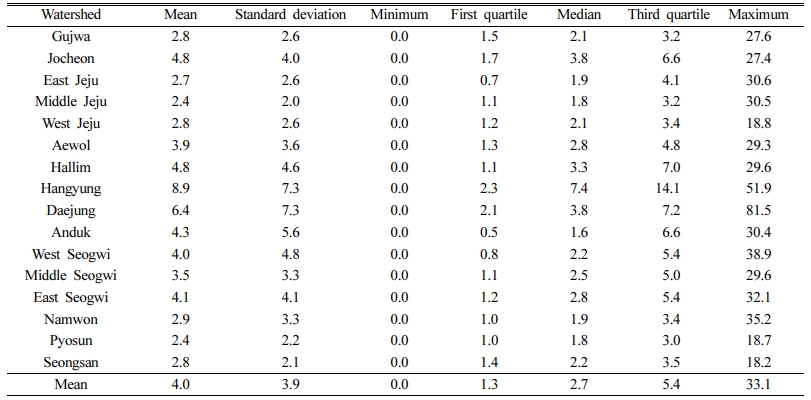 제주도 전역을 대상으로 지하수 수질 현황 파악을 위하여 1993~2019년 기간 중 원상복구 관정을 포함한 공공 및 사설관정 5,112공(1,363/3,749공)에 대하여, 총 37,379번의 성분별 지하수 수질자료를 분석하였다(Table 1). 현재 제주도 내 지하수 수질검사는 음용수와 그 외 용수가 각각 2년과 3년 간격으로 실시하지만, 질산성질소의 경우 1993년 이후 용도별/관정별 수질오염 정도에 따라 7~131회로 분석 회수의 편차가 매우 크게 나타났다. 이러한 결과를 토대로 16개 유역에 대한 질산성질소 평균값을 분석한 결과, 전체 평균과 중앙값은 각각 4.0 mg/L와 2.7 mg/L으로 오염 정도가 상대적으로 낮은 반면 최대값은 33.1 mg/L로 일시적인 오염물질 유입으로 인한 관정 내 지하수 오염이 급격하게 악화되는 것으로 나타났다(Table 2).