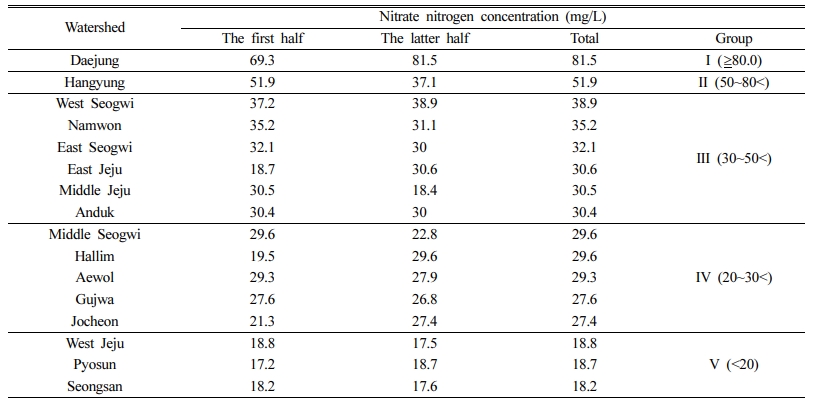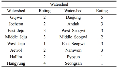 이때 등급 부여는 앞서 분석된 유역별 질산성질소 최대 오염 농도를 기준으로 가장 높은 I그룹(80.0 mg/L 이상)인 대정유역을 5등급, II그룹(50~80 mg/L 미만)인 한경유역을 4등급, III그룹(30~50 mg/L 미만)인 서서귀, 남원, 동서귀, 동제주, 중제주, 안덕유역을 3등급, IV그룹(20~30 mg/L 미만)인 중서귀, 한림, 애월, 구좌, 조천유역을 2등급, V그룹(20 mg/L 미만)인 서제주, 표선, 성산유역을 1등급으로 각각 구분하였다(Table 10).