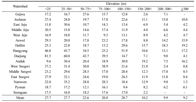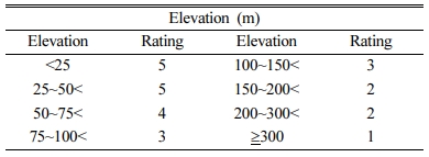 해발고도 특성은 제주도의 지형적 특성에 따른 해발고도별 관정의 분포 특성을 이용하여, 해발고도 구간을 인자로 설정하여 등급과 가중치를 부여하는 방식으로 적용하였다. 분석에 이용된 관정은 총 5,109개로, (Table 4)에서 제시된 해발고도별 질산성질소 최대농도 분포에 따라 8개 구간에 대한 등급을 부여하였다,