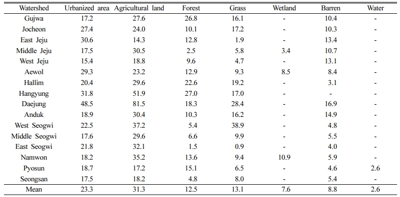 토지이용 변화는 환경부의 대분류 토지피복도로 분석이 가능하며(https://egis.me.go.kr), 1980~2014년 기간 중 산림 면적의 감소가 가장 큰 반면 초지, 시가지, 밭, 시설재배지 등은 면적이 크게 증가한 것으로 나타났다(Song et al., 2018). 이 중 2014년 한경유역과 대정유역의 농경지 면적은 각각 전체면적의 66.0%와 60.9%로 높게 나타났다.