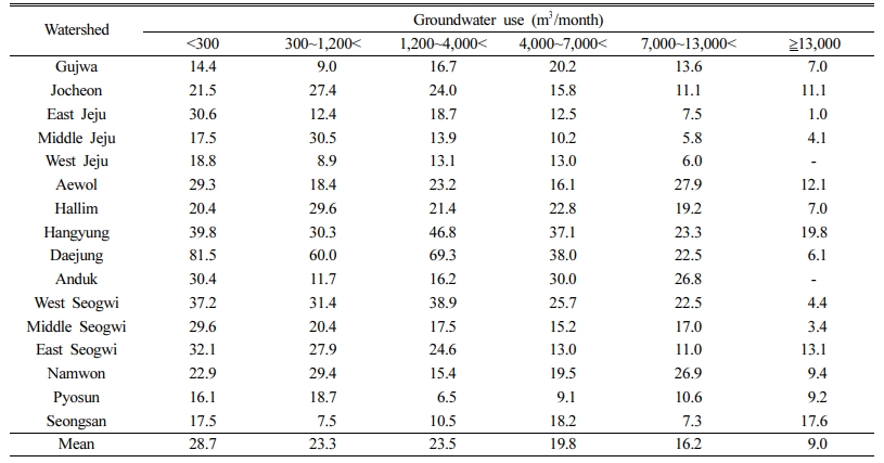 2014~2019년 기간의 관정별 평균 월별 이용량 자료를 기초로, 빈도분석을 통하여 이용량 범위를 6구간으로 구분하였다. 이때 분석은 이용량이 누락된 사설관정 등을 제외한 총 4,182개 관정 자료를 이용하였다(Fig. 5).