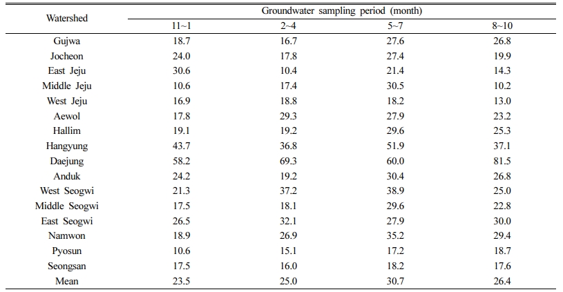 관정별 수질분석 시기별 오염등급 구분을 위하여, 지하수 이용 시기를 고려한 관정별 지하수 시료의 채수 시기를 3개월 단위(2~4월, 5~7월, 8~10월, 11~1월)로 구분하여 분석하였다. 분석 결과 5~7월에 가장 높은 분석결과가 나타났으며, 8~10월, 2~4월, 11~1월 순으로 나타났다(Table 8).