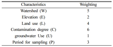 WELCUP 기준은 유역(W), 해발고도(E), 토지이용(L), 관정별 오염 현황(C), 지하수 이용량(U), 시료 채취 시기(P)로, 각각의 가중치는 5, 2, 4, 6, 1, 3이다. 6가지 기준의 가중치와 각 기준별 등급을 곱한 값으로 계산된 WELCUP 지수의 범위는 21~108점이다.