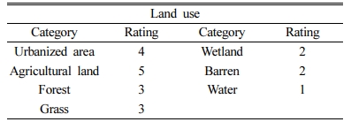 토지이용 특성은 환경부 토지피복도의 대분류 기준을 적용하여 총 7가지로 분류하였으며, 각 특성별 질산성질소 평균농도가 높은 농경지(31.3 mg/L)와 시가지(23.3 mg/L)를 각각 5등급과 4등급을 부여하였으며, 평균농도가 유사한 초지(13.1 mg/L)와 산림(12.5 mg/L)은 3등급으로 설정하였다. 또한 평균농도가 유사한 나지(8.8 mg/L)와 습지(7.6 mg/L)은 2등급으로, 평균농도가 가장 낮은 수역(2.6 mg/L)은 1등급을 부여하였다(Table 12).