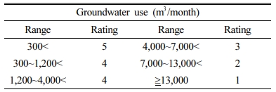 이용량 특성은 공공 및 관정의 월별 이용량 분석 결과를 이용하여, 각 관정별 분기별 이용량에 따른 질산성질소 농도의 상관성에 따른 등급과 가중치를 부여하는 방식으로 적용하였다. (Table 7)에서 제시된 질산성질소 평균농도를 기준으로 300 m3/월 미만 구간(28.7 mg/L)은 5등급, 1,200~4,000 m3/월 미만 구간(23.5 mg/L)과 300~1,200 m3/월 미만 구간(23.3 mg/L)은 4등급을 부여하였다. 또한 4,000~7,000 m3/월 미만 구간(19.8 mg/L)과 7,000~ 13,000 m3/월 미만 구간(16.2 mg/L)은 각각 3등급과 2등급으로 구분하였으며, 13,000 m3/월 이상 구간(9.0 mg/L)은 가장 낮은 1등급을 부여하였다(Table 14).